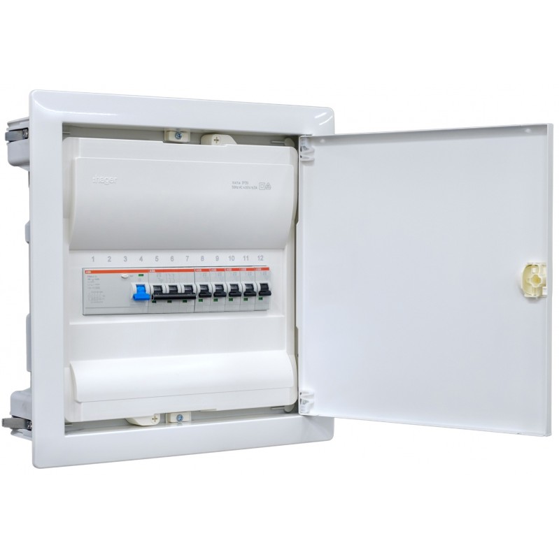 Hager Hohlwandverteiler 1-reihig VH12NC ANSCHLUSSFERTIG verdrahtet mit Klemmblock. Bestückung Legrand 1x FI 4-pol. + 1x 3pol + 5