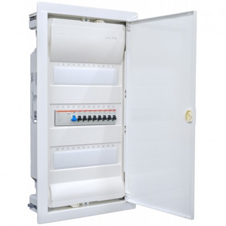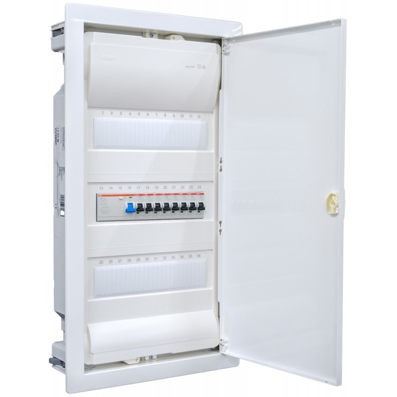 Hochwertige Verteilerserie Volta Hohlwandverteiler 3-reihig VH36NC Angeboten wird eine anschlussfertig vorverdrahtete Unterverteilung. Bestückung Legrand 1x FI 4-polig + 8x LS B16A. Die Verteiler sind komplett anschlussfertig, mit Verdrahtungsleitung in H07V-K 10mm². Jede Unterverteilung wird mit Tür und Hauptleitungsabzweigklemmblock (HLAK) ausgeliefert, dies gewährleistet eine schnelle unkomplizierte Montage. In Europa hergestellt.