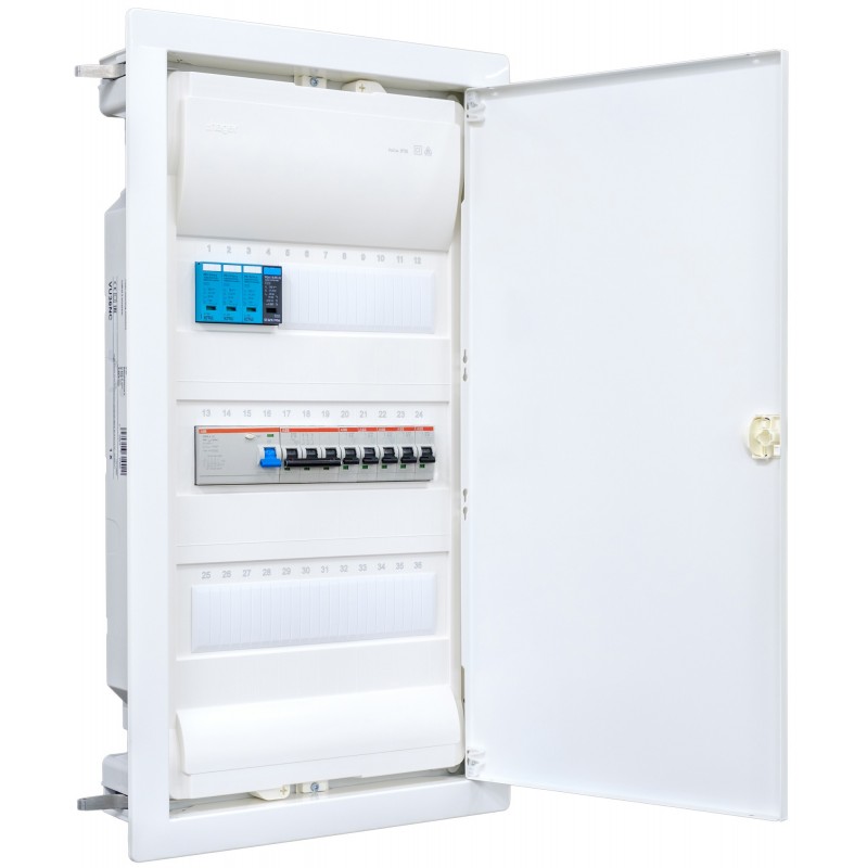 Hager Hohlwandverteiler 3-reihig VH36NC mit Überspannungsschutz. ANSCHLUSSFERTIG verdrahtet mit Klemmblock. Bestückung Legrand 1