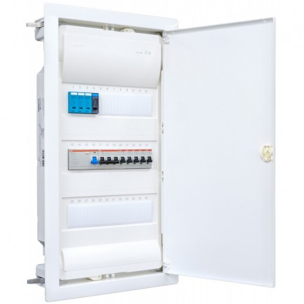 Hochwertige Verteilerserie Volta Hohlwandverteiler 3-reihig VH36NC Angeboten wird eine anschlussfertig vorverdrahtete Unterverteilung mit Überspannungsschutz - Kombiableiter Typ 1+2+3 KIWA PO I 3+1m e 280V/7kA. Bestückung Legrand 1x FI 4-pol. + 1x 3pol + 5x 1pol LS B16A. Die Verteiler sind komplett anschlussfertig, mit Verdrahtungsleitung in H07V-K 10mm². Jede Unterverteilung wird mit Tür und Hauptleitungsabzweigklemmblock (HLAK) ausgeliefert, dies gewährleistet eine schnelle unkomplizierte Montage. In Europa hergestellt.