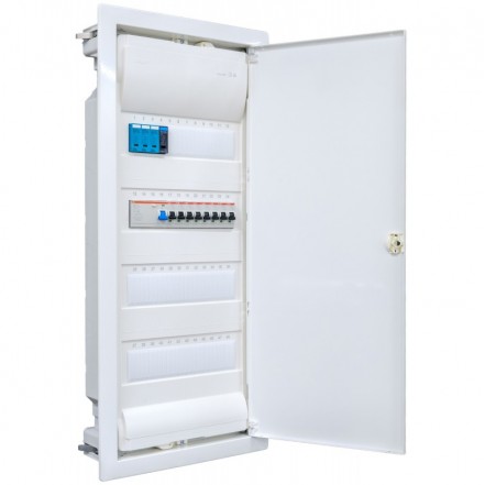 Hochwertige Verteilerserie Volta Hohlwandverteiler 4-reihig VH48NC Angeboten wird eine anschlussfertig vorverdrahtete Unterverteilung mit Überspannungsschutz - Kombiableiter Typ 1+2+3 KIWA PO I 3+1m e 280V/7kA. Bestückung Legrand 1x FI 4-polig + 8x LS B16A. Die Verteiler sind komplett anschlussfertig, mit Verdrahtungsleitung in H07V-K 10mm². Jede Unterverteilung wird mit Tür und Hauptleitungsabzweigklemmblock (HLAK) ausgeliefert, dies gewährleistet eine schnelle unkomplizierte Montage. In Europa hergestellt.