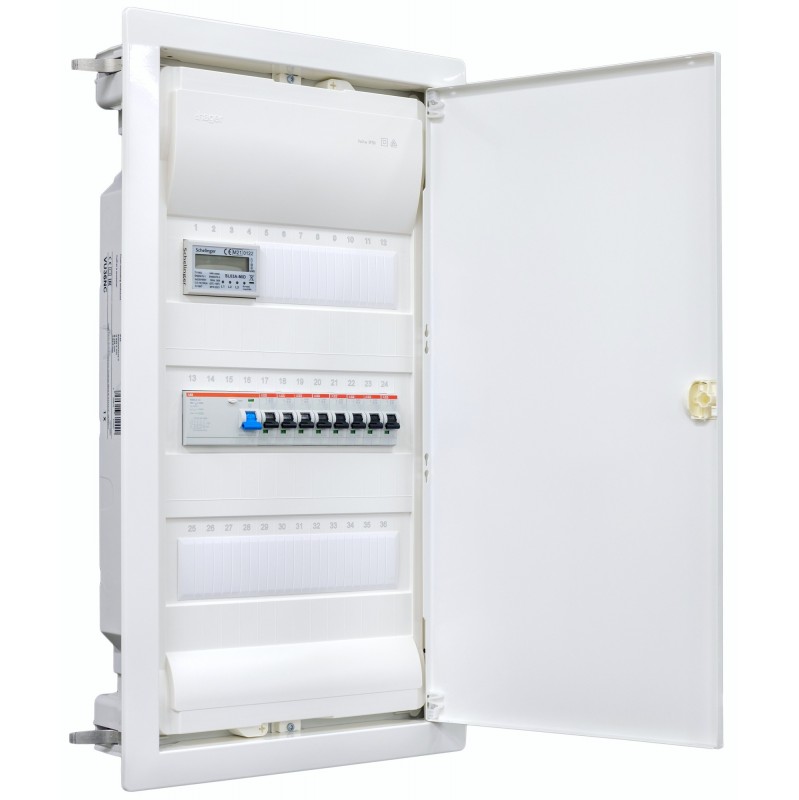 Mit Zähler Bestückter Hager Hohlwandverteiler 3-reihig VH36NC ANSCHLUSSFERTIG verdrahtet mit Klemmblock. Bestückung Legrand 1x F