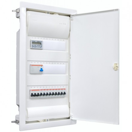 Mit Zähler Bestückter Hager Hohlwandverteiler 3-reihig VH36NC ANSCHLUSSFERTIG verdrahtet mit Klemmblock. Bestückung Legrand 1x F