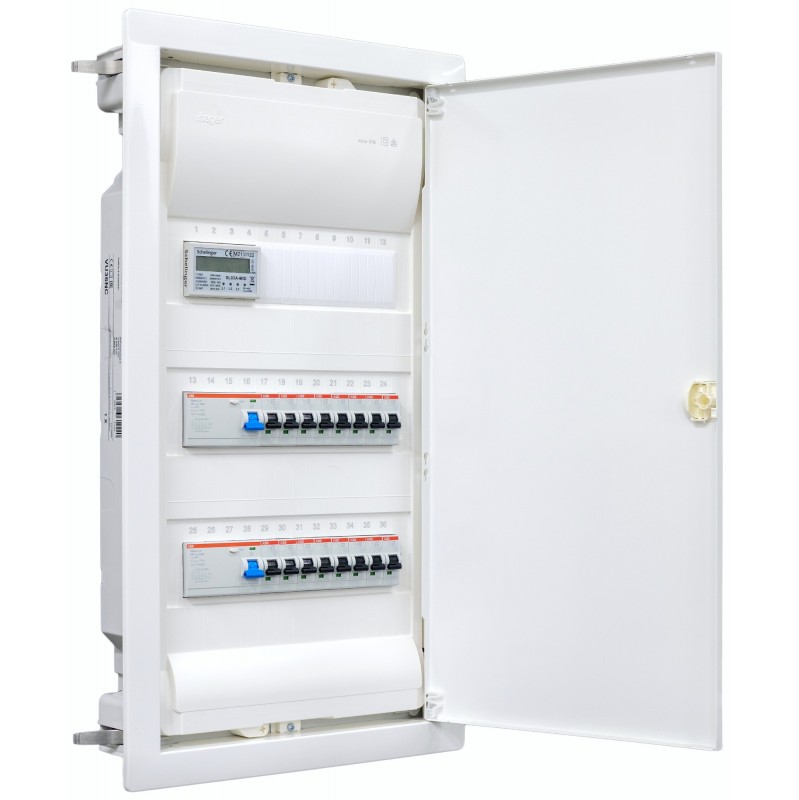 Mit Zähler Bestückter Hager Hohlwandverteiler 3-reihig VH36NC ANSCHLUSSFERTIG verdrahtet mit Klemmblock. Bestückung Legrand 2x F