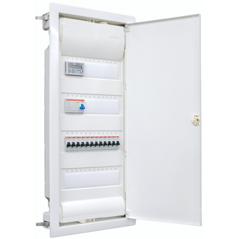 Mit Zähler Bestückter Hager Hohlwandverteiler 4-reihig VH48NC ANSCHLUSSFERTIG verdrahtet mit Klemmblock. Bestückung Legrand 1x F