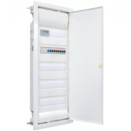 Hochwertige Verteilerserie Volta Unterputzverteiler 5-reihig VU60NC Angeboten wird eine anschlussfertig vorverdrahtete Unterverteilung mit Überspannungsschutz - Kombiableiter Typ 1+2+3 KIWA PO I 3+1m e 280V/7kA. Bestückung Legrand 1x FI 4-pol. + 1x 3pol + 5x 1pol LS B16A. Die Verteiler sind komplett anschlussfertig, mit Verdrahtungsleitung in H07V-K 10mm². Jede Unterverteilung wird mit Tür und Hauptleitungsabzweigklemmblock (HLAK) ausgeliefert, dies gewährleistet eine schnelle unkomplizierte Montage. In Europa hergestellt.